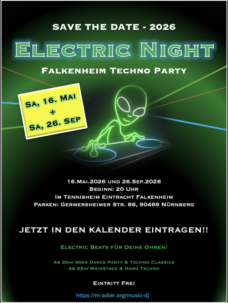Im September 2025 starte ich ein Experiment: Ich möchte gern kleine Techno-Partys anbieten, Eintritt frei und Getränke zu fairen Preisen. Die Musik soll voller Energie und Spaß mitreißen und jeden Körper in Bewegung versetzten. Keine teueren DJs, keine teuren Tickets und die Uhrzeiten sind auch für Familien-Menschen tauglich.