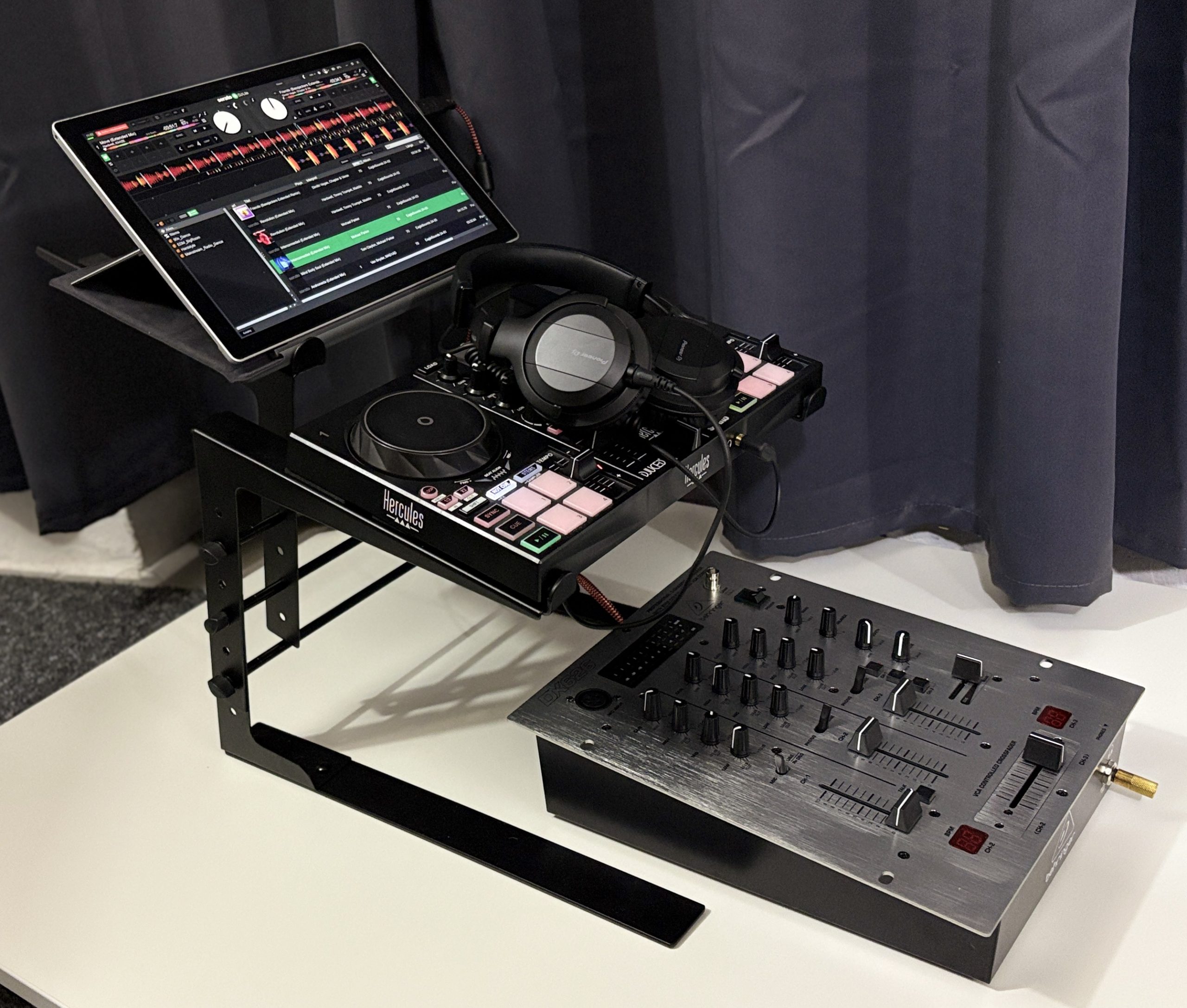 DJ Rack Easy. Hercules Impulse 200 Mixer, Controller, Windows Laptop, DJ Software, Rack Stand, Kopfhörer, Mikrofon, Kabel.