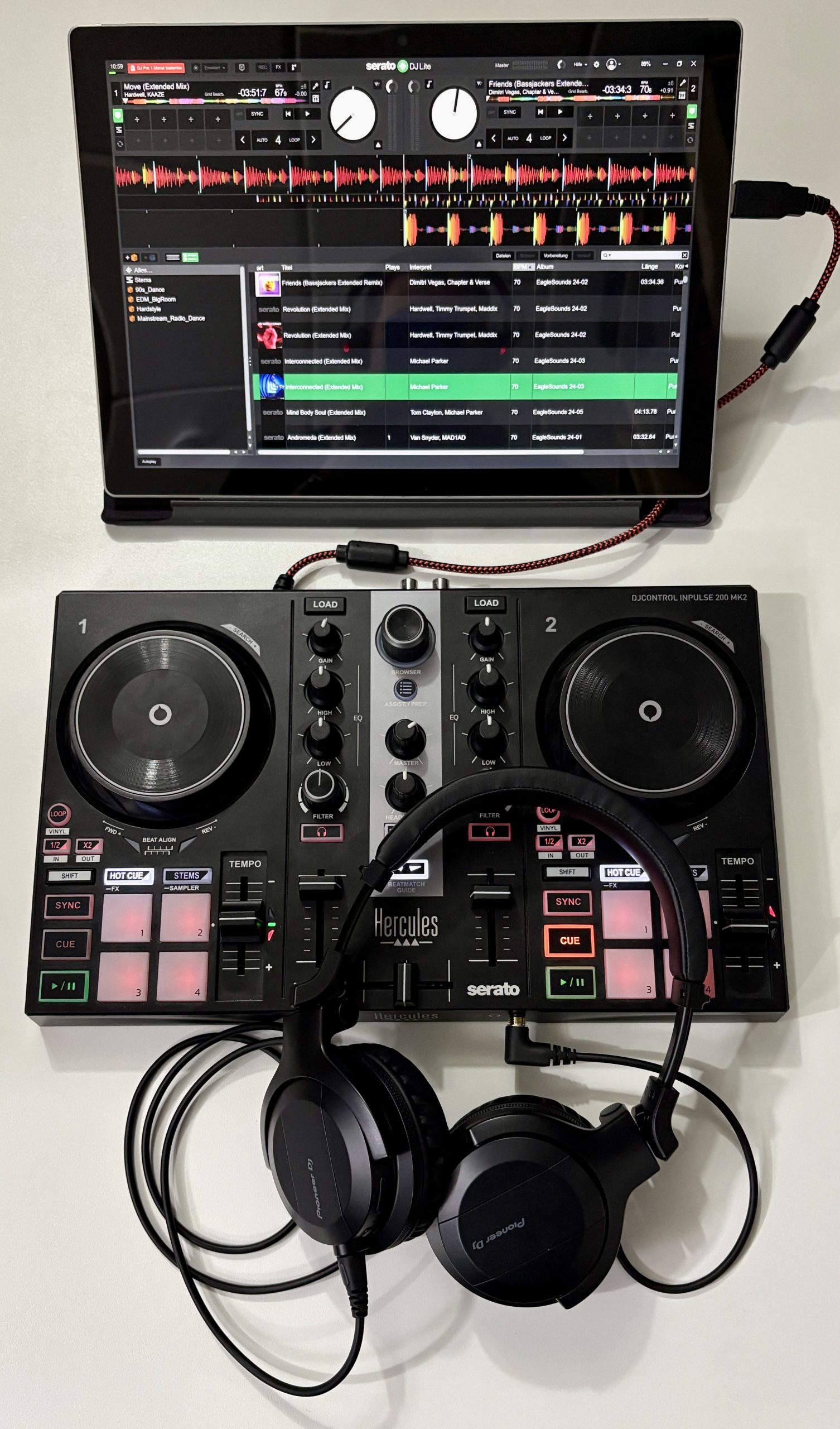 Hercules Impulse 200 DJ Controller. Zusammen mit einen Windows-Laptop und Senator DJ Pro Software (Ohne Musik, die muss per USB-Stick selbst mitgebracht werden). Inklusive Kabel und Pioneer DJ Kopfhörer.