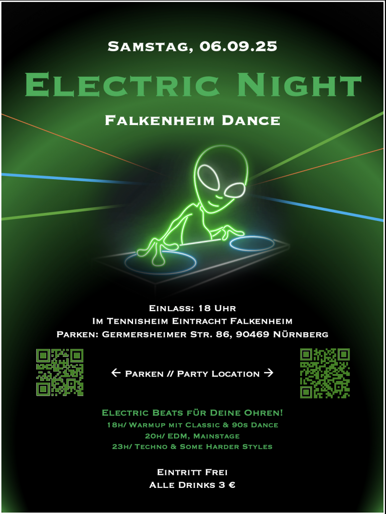 Electric Night – Beginn 18 Uhr bis ca. 1 Uhr – Eintritt frei – Alle Getränke 3 € – Musik von 90’s Dance über MainStage EDM zu Hardstyle und Hard-Techno.