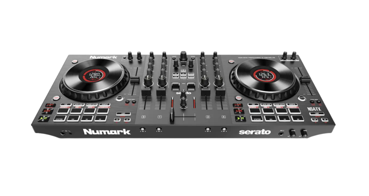 Numark NS4FX – 4 Kanal DJ Controller für Fortgeschrittene. Zusammen mit einen Windows-Laptop und Serato DJ Pro Software (Ohne Musik, die muss per USB-Stick selbst mitgebracht werden). Inklusive Kabel, Rack und Pioneer DJ Kopfhörer.